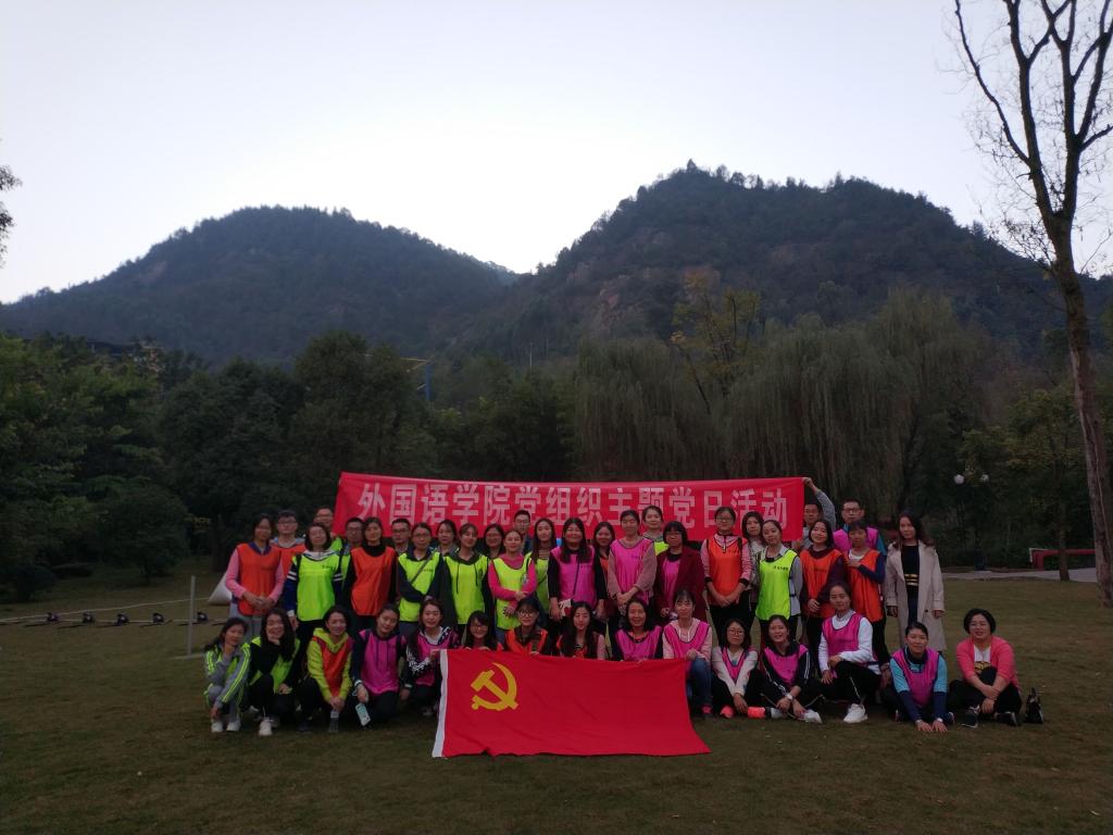 为进一步增强党员的党性觉悟和修养,提高全体党员教师综合素质,外国语学院党总支于11月1日组织学院全体党员前往江津双福森语001教育基地开展了十月主题党日活动。本次活动共有四十余名党员参加,在基地教练的组织下分为三小队进行室内党的理论知识学习和室外素质拓展。