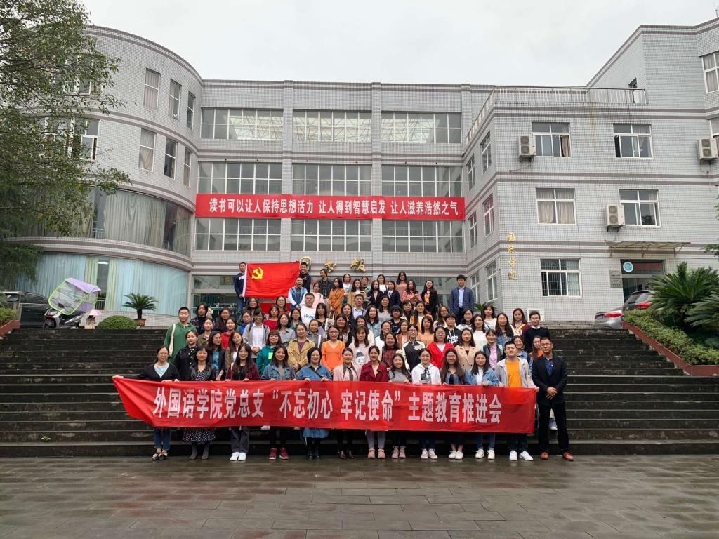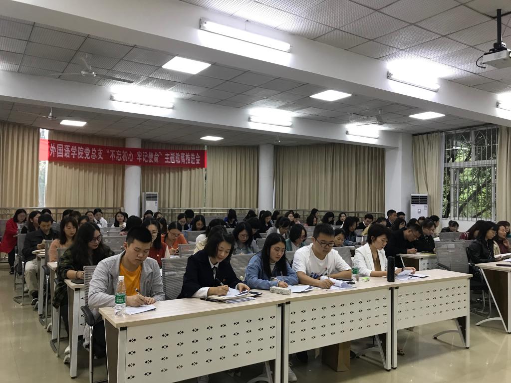 在新中国70华诞之际,为深入贯彻落实“不忘初心、牢记使命”精神,10月10日下午,我校外国语学院党总支于图书馆A馆一楼开展了“不忘初心、牢记使命”主题教育推进会,外国语学院全体党员参加此次会议。