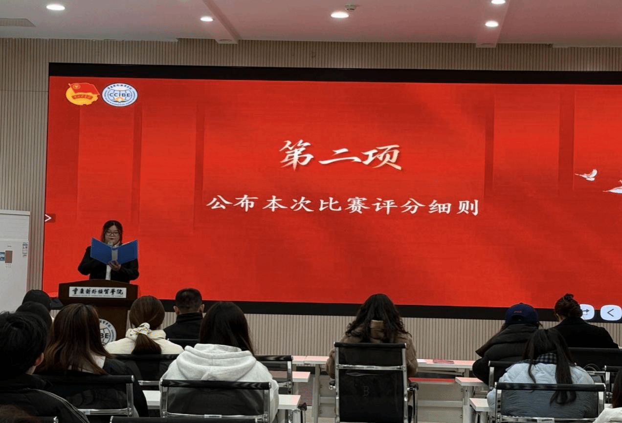 活动伊始,全体人员齐唱中国共产主义青年团团歌《光荣啊,中国共青团》,激昂的旋律拉开了比赛序幕。接着,主持人梁馨元详细解读了本次活动的评分细则,包括选手整体形象气质、互动能力与感染力,内容的真实性与规范性等核心评分维度,让在场选手与观众对评选标准了然于心。随后,参赛选手们按照抽签顺序依次登台展示,他们凭借扎实的中英双语功底,或娓娓道来,或激情澎湃,以流畅的表达能力和饱满的精神状态,围绕“合力合川・最美江湾”主题展开精彩解说。选手们结合江湾历史文化,用双语讲述往昔故事,聚焦江湾生态发展,以专业视角阐释生态之美,充分展现了当代大学生的青春风采与跨文化沟通潜力。在选手完成双语解说后,评委老师们结合专业领域及活动主题进行点评及提问,为选手提升跨文化传播能力提供精准指引。期间,现场观众共同观看了以合川秀丽风光与人文底蕴为主题的视频,进一步深化了大家对活动主题的理解。紧接着,由校团委干事樊林鑫老师公布最终成绩,肯定了所有参赛选手的积极参与和出色表现。活动最后,全体参赛选手、评委及工作人员合影留念。